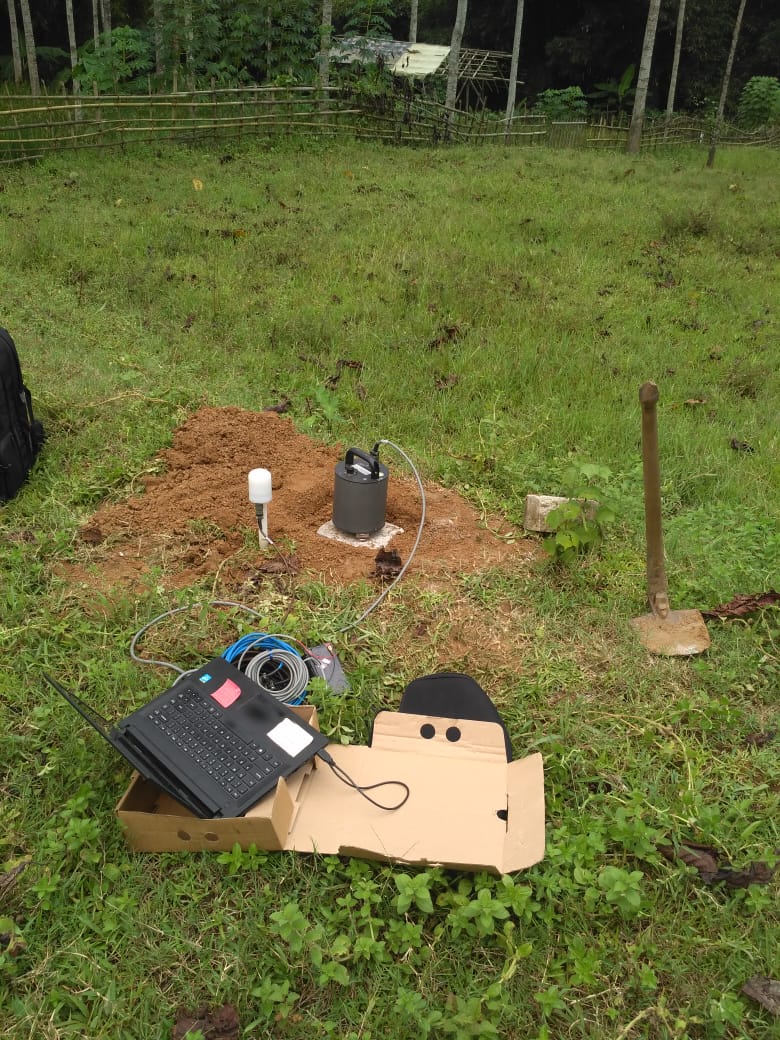 - Letakkan Seismometer pada titik yang telah ditentukan, lalu dilakukan leveling berdasarkan nivo/water level untuk menentukan bahwa alat sudah berada pada posisi rata secara vertikal maupun horizontal.